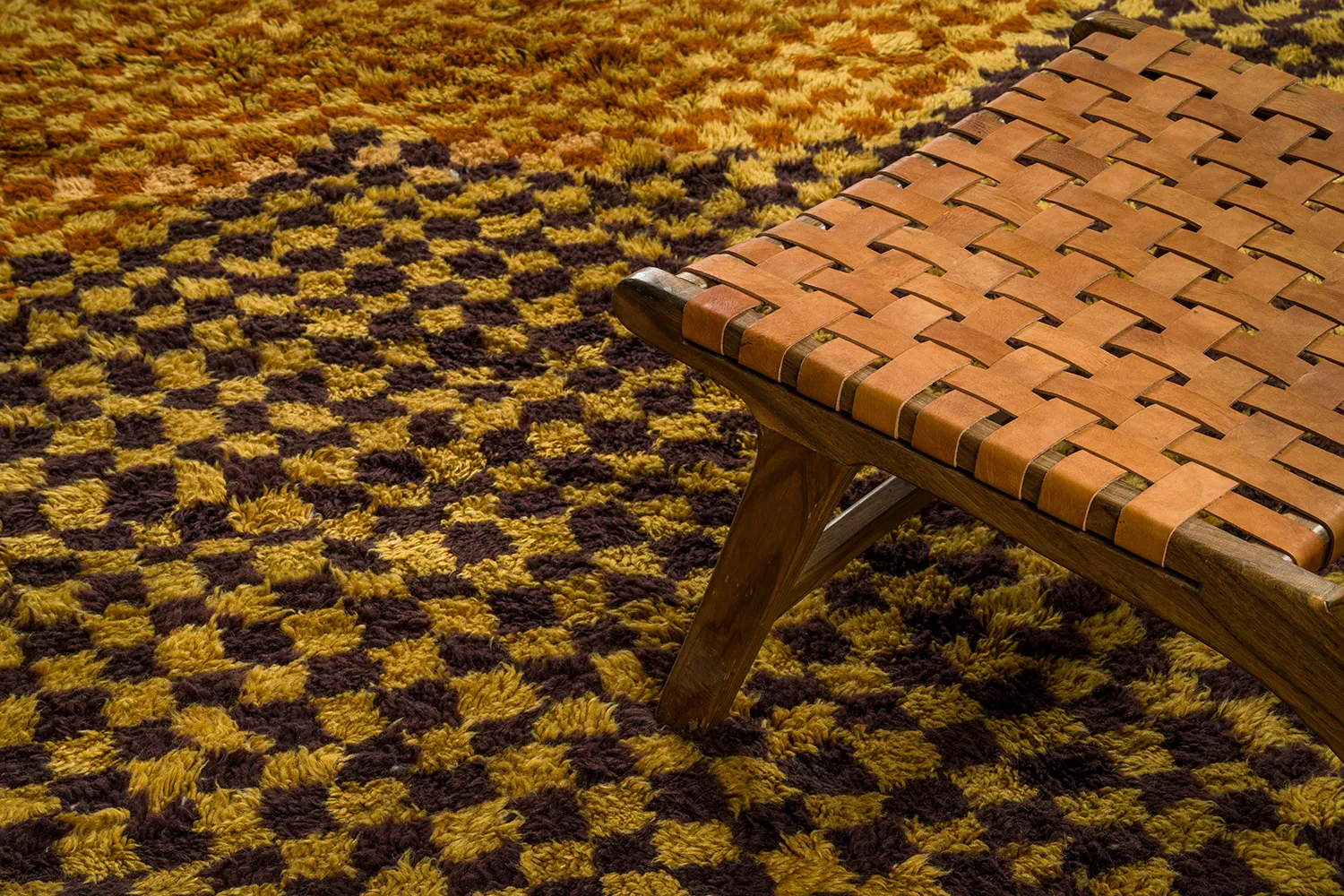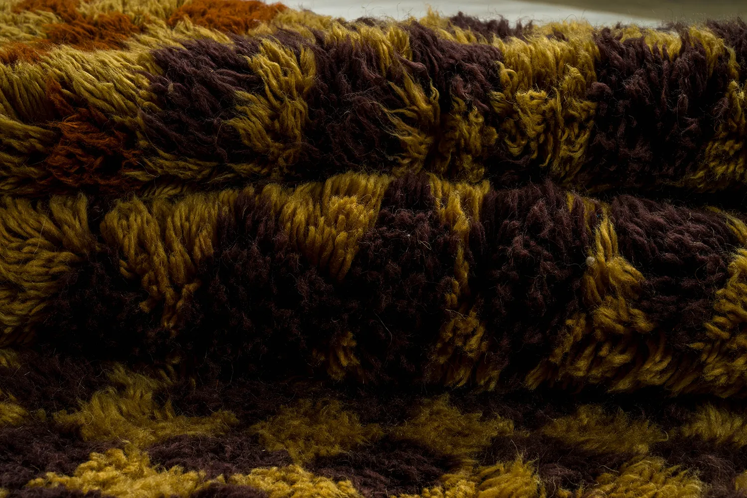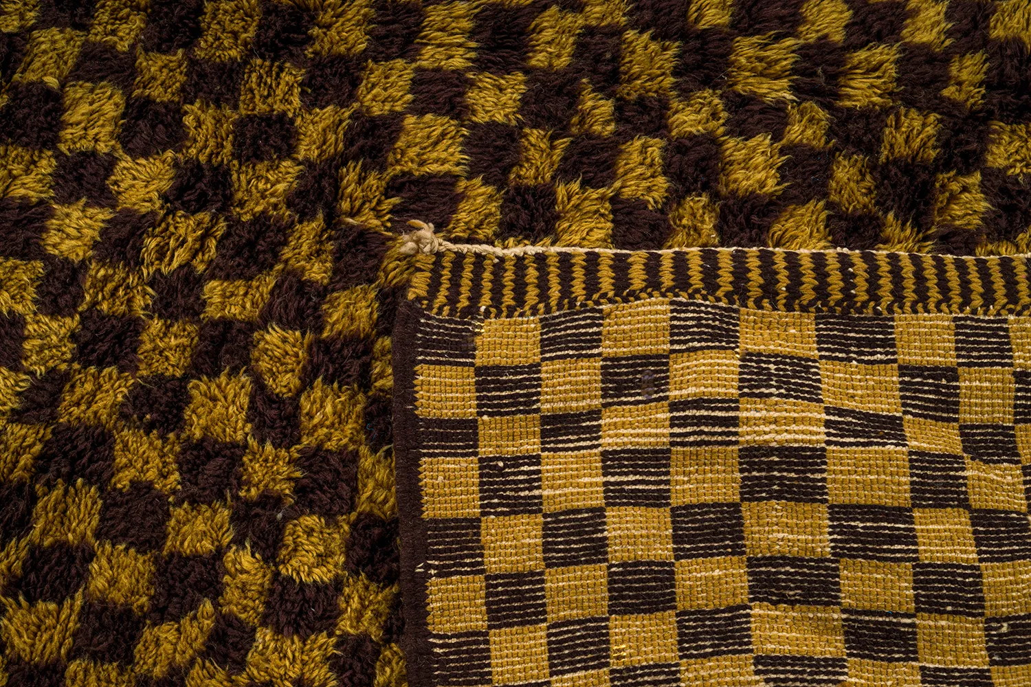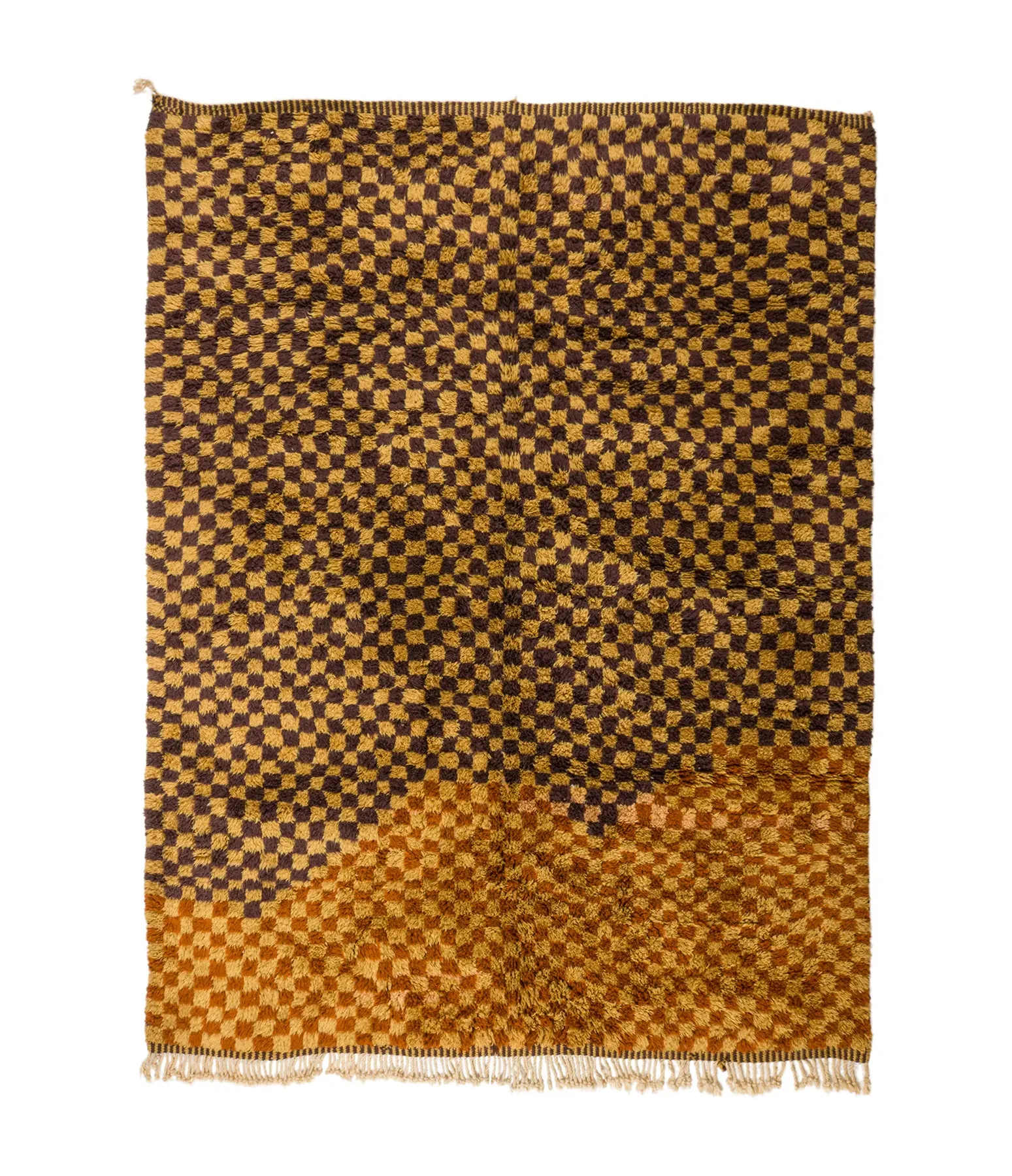 Checkerboard Pattern with Dimensional Depth – This Moroccan rug is a vibrant celebration of color and texture. The checkerboard pattern, typically woven with a single color, takes on a new dimension in this design with the skillful integration of a contrasting shade of brown. This unexpected touch adds depth and visual interest to the rug, creating a captivating interplay of light and shadow.