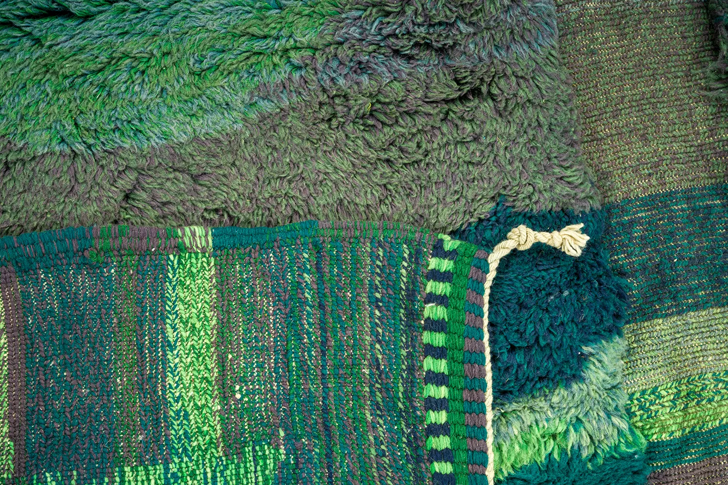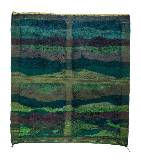 Verdant Horizon Beni Mrirt Rug – Hand-knotted in a striking palette of deep greens, forest tones, and charcoal, this Beni Mrirt rug evokes a shifting landscape. High and flat pile alternate in layered bands, adding texture and topography to its woven surface. A grounding piece with a painterly soul.