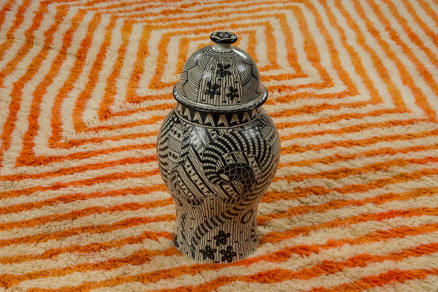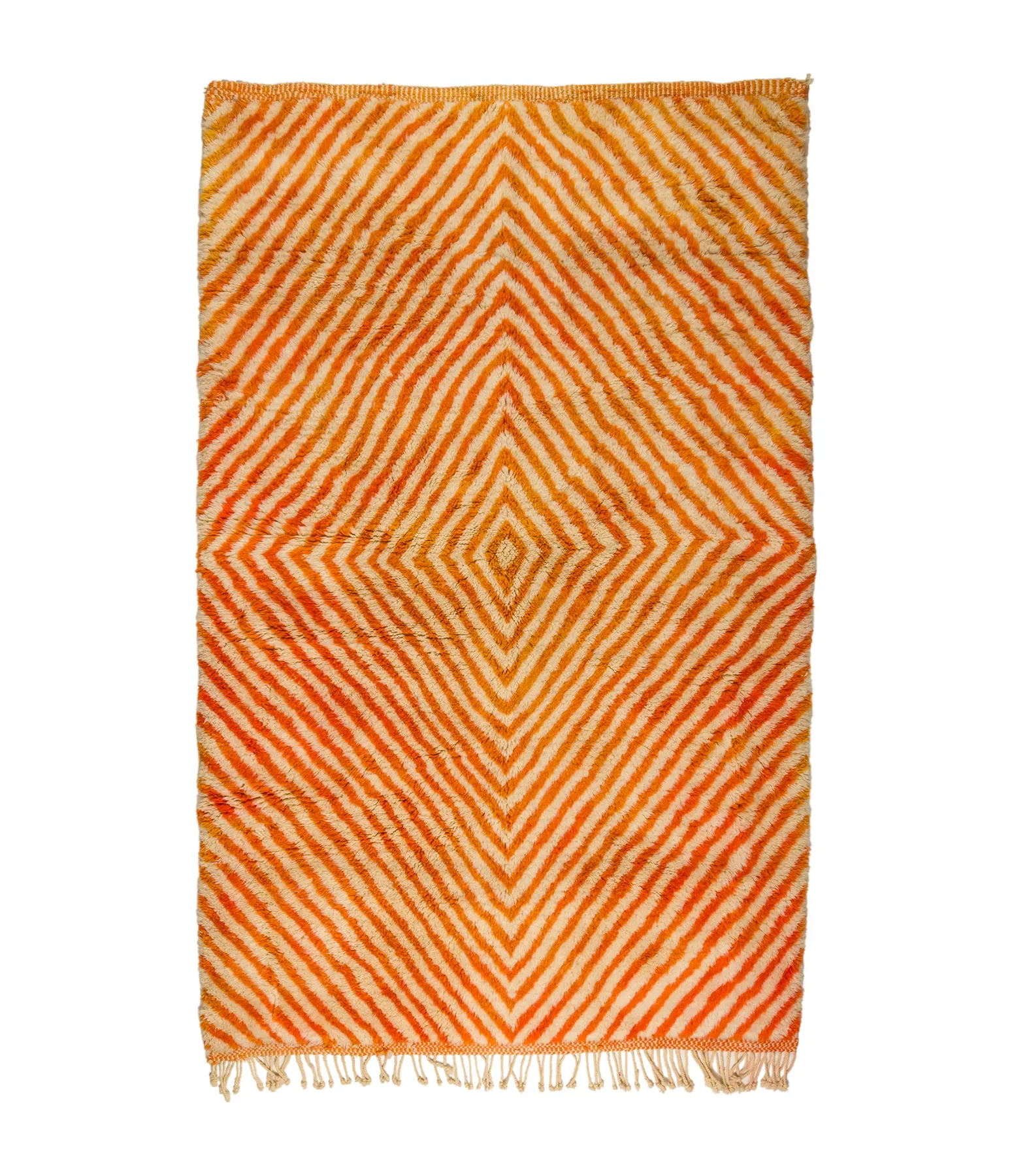 Sunburst Stripes and Optical Depth – Radiating from a diamond-shaped center, this hand-knotted rug pulses with concentric stripes that create a visual rhythm of energy and warmth. Its symmetry feels architectural, while the softness of the wool keeps it grounded in tactility.