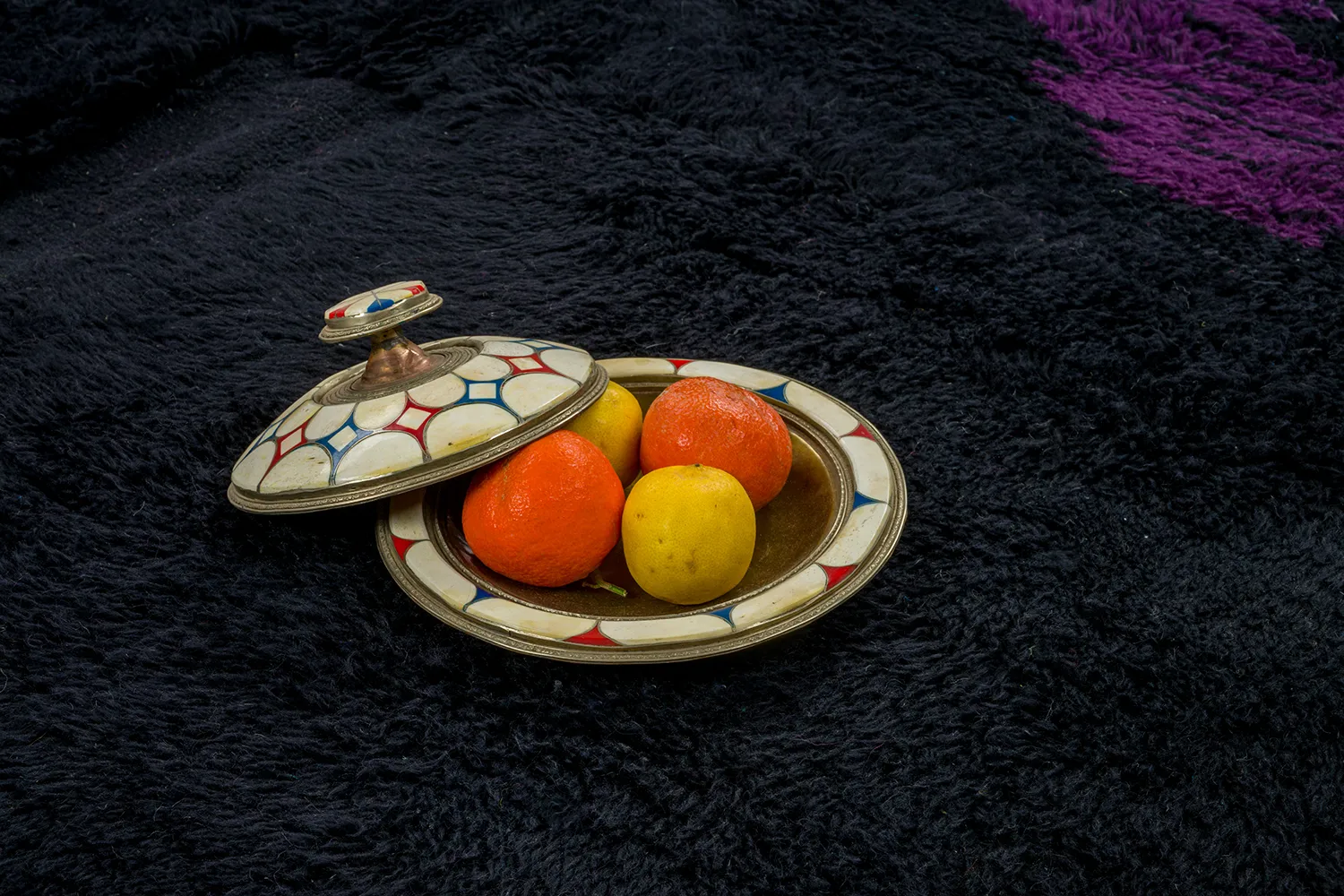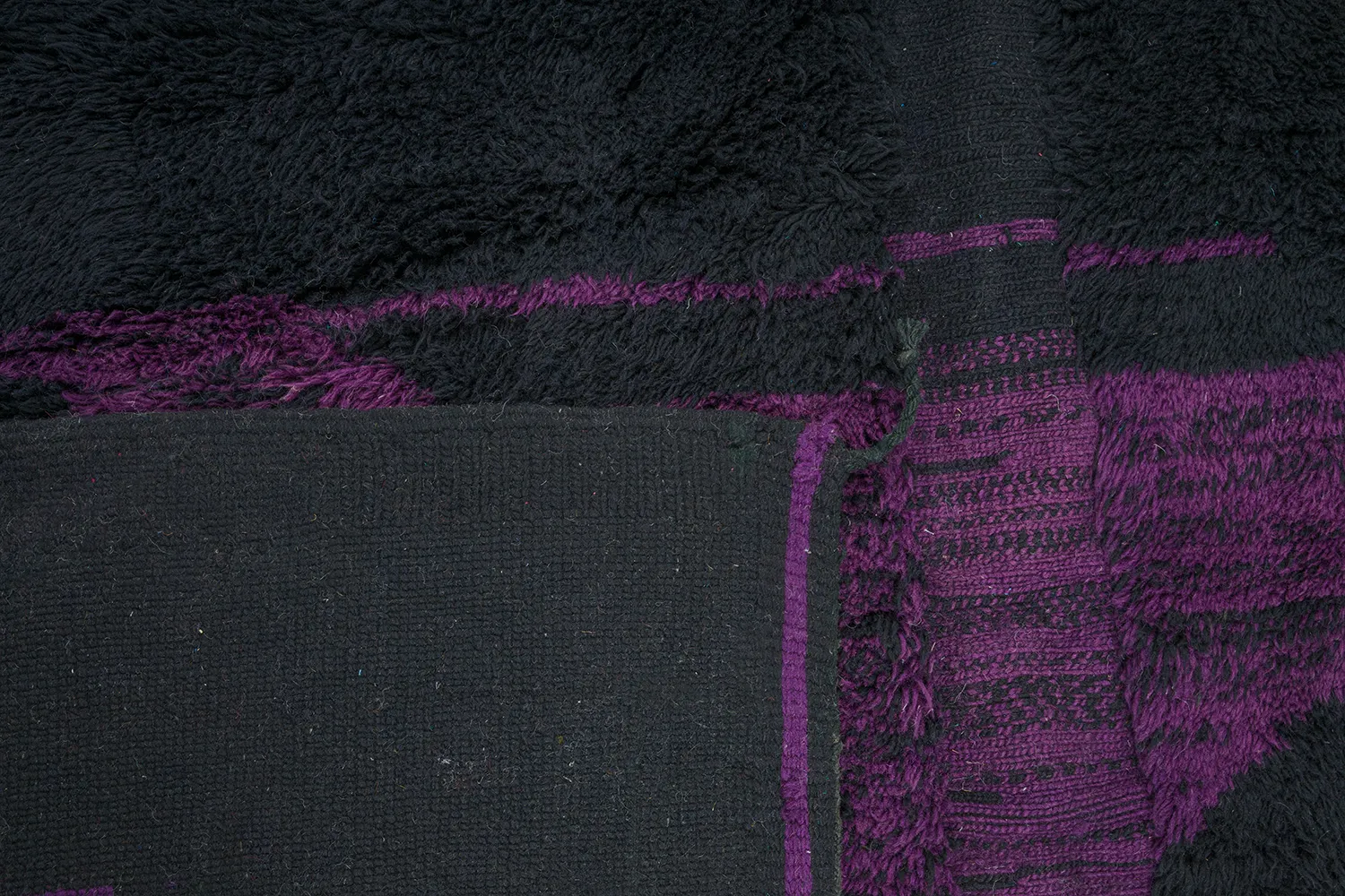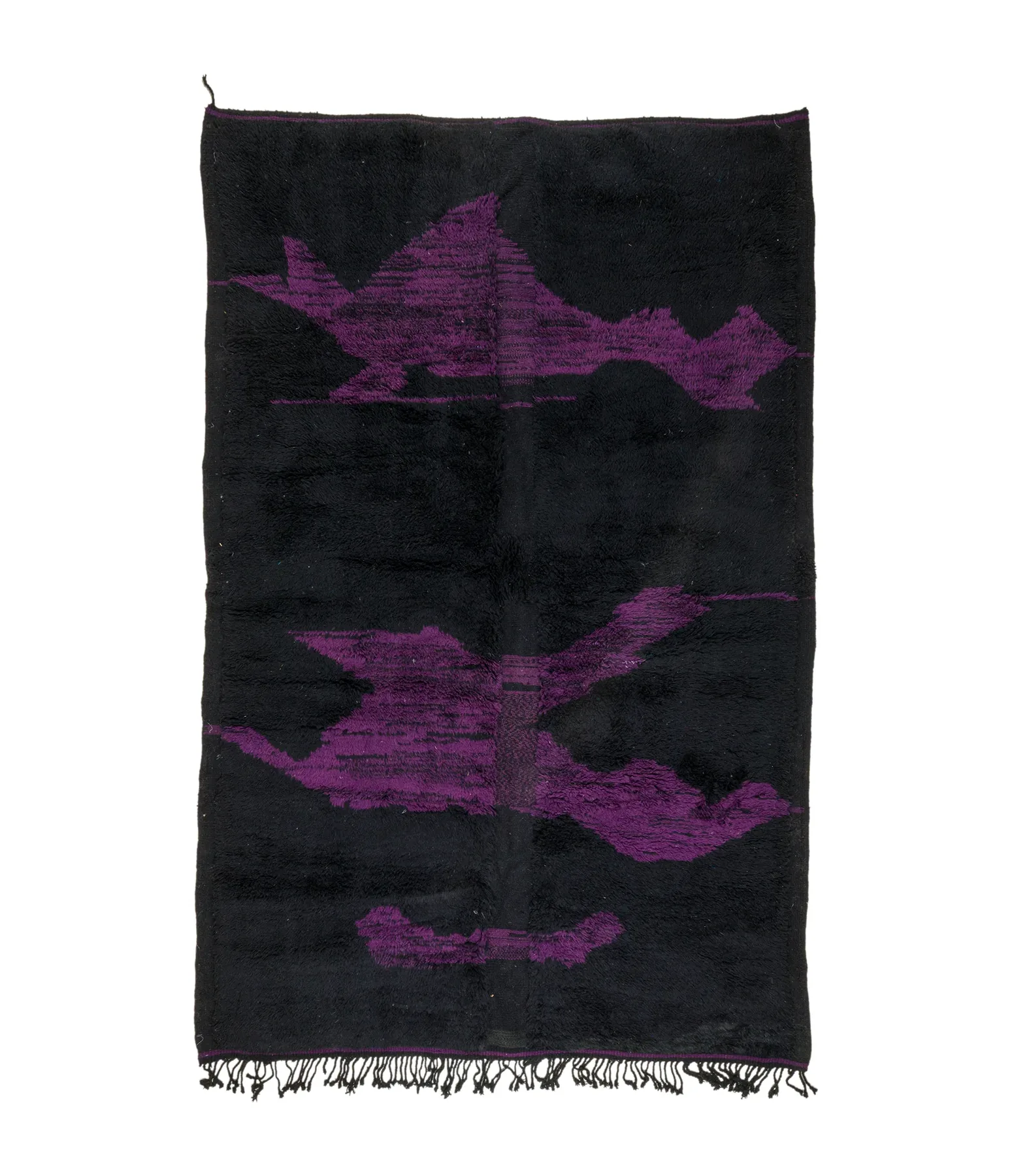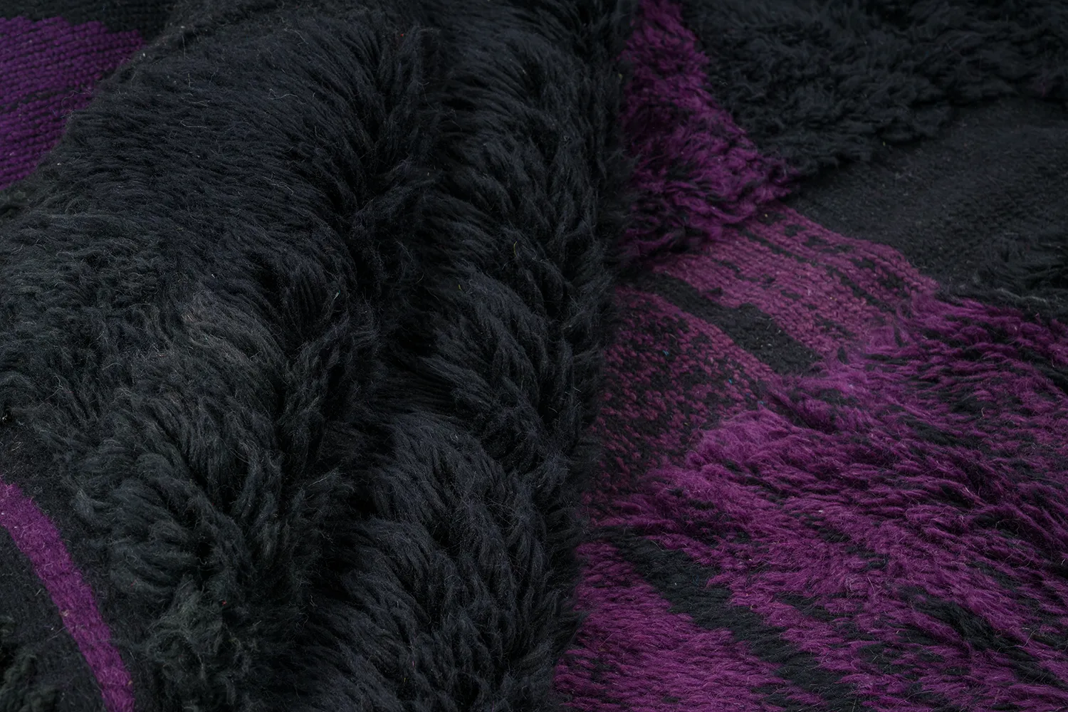 Black Beni Mrirt with Abstract Violet Patterning – A moody Beni Mrirt where black dominates the field like nightfall, interrupted by clouds of violet that pulse across the surface. The abstract forms feel cosmic — a dreamy, handwoven landscape of shadows and color. Soft yet powerful, minimal yet expressive.