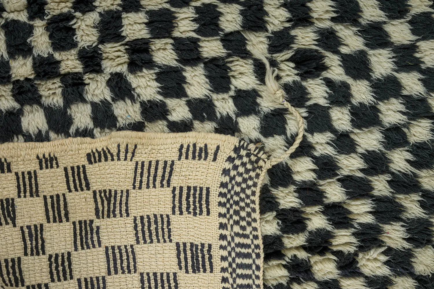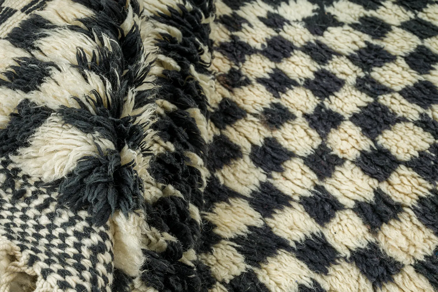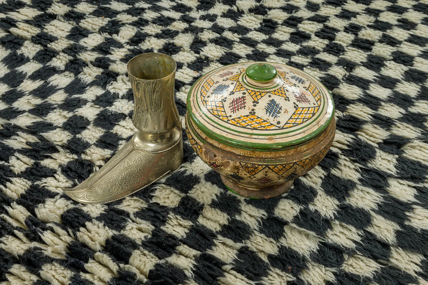 Grid Pattern Wool Runner – This elongated Beni Mrirt runner reimagines a classic design through a dynamic grid that shifts subtly with movement, like fabric caught mid-fold. Its high-pile texture adds tactile depth, while the optical weave draws the eye forward. A corridor statement with architectural edge.
