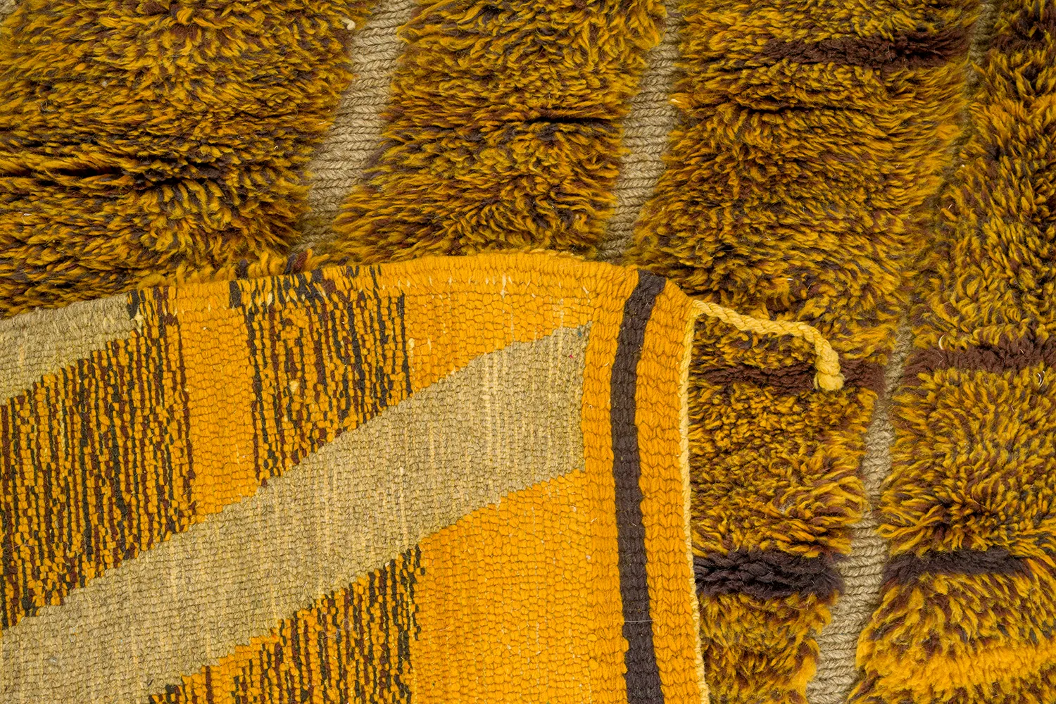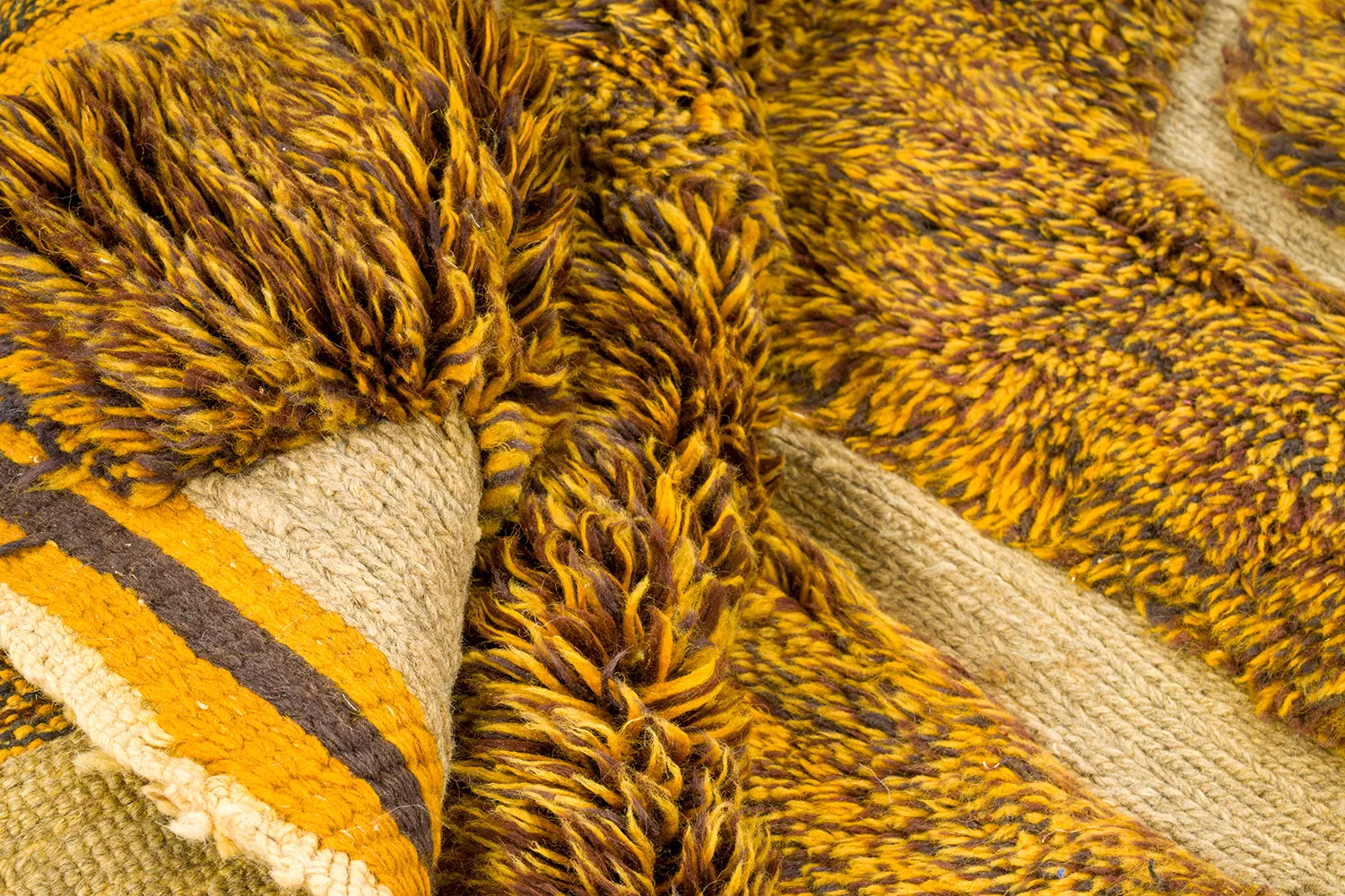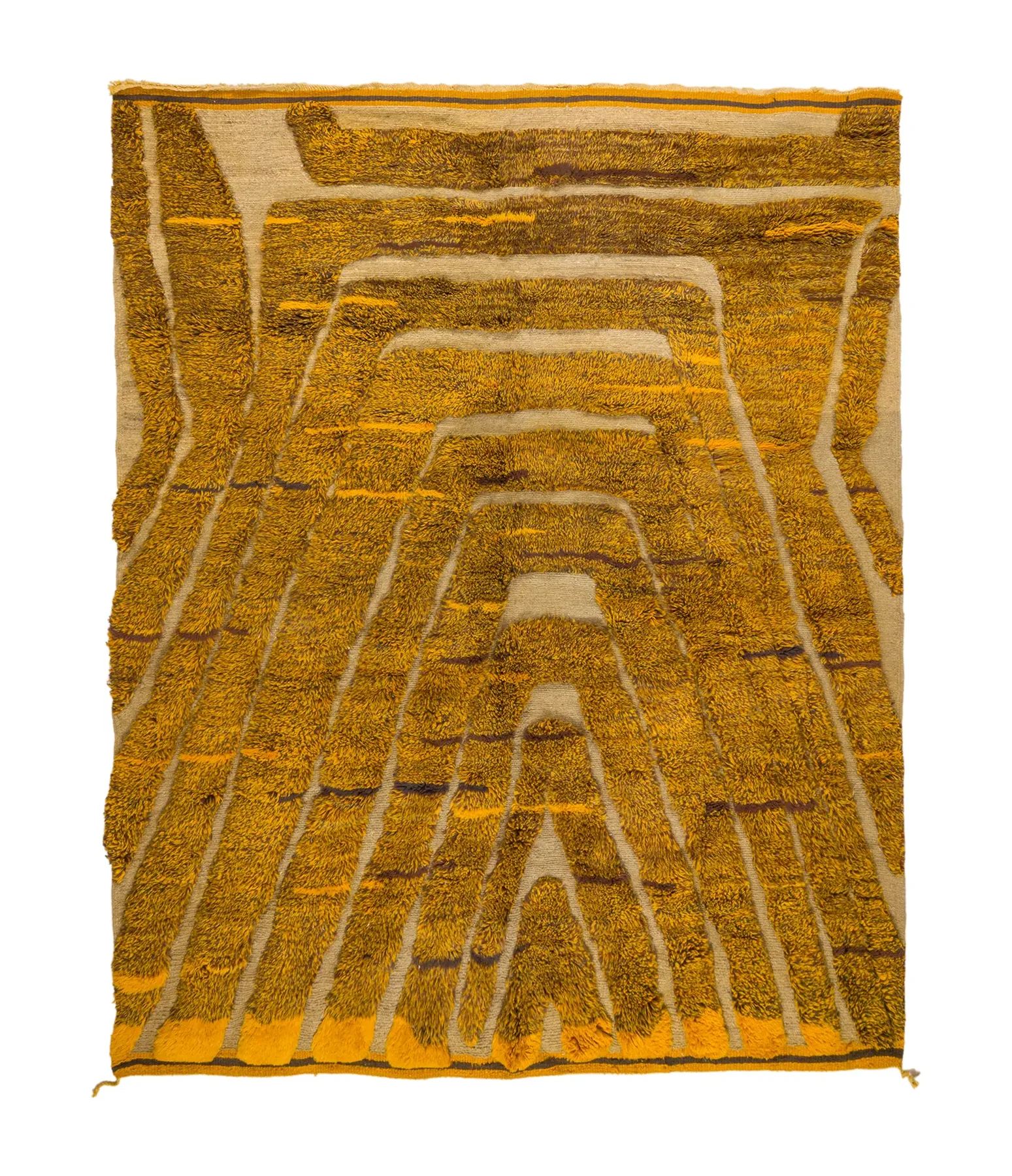 Golden Maze with Sculpted Pile – Woven in a glowing mustard-gold, this rug alternates between high and flat pile to form a striking maze-like design. The raised wool lines feel architectural, casting soft shadows across the surface. Sculptural yet soft — a bold, modern interpretation of Moroccan weaving.