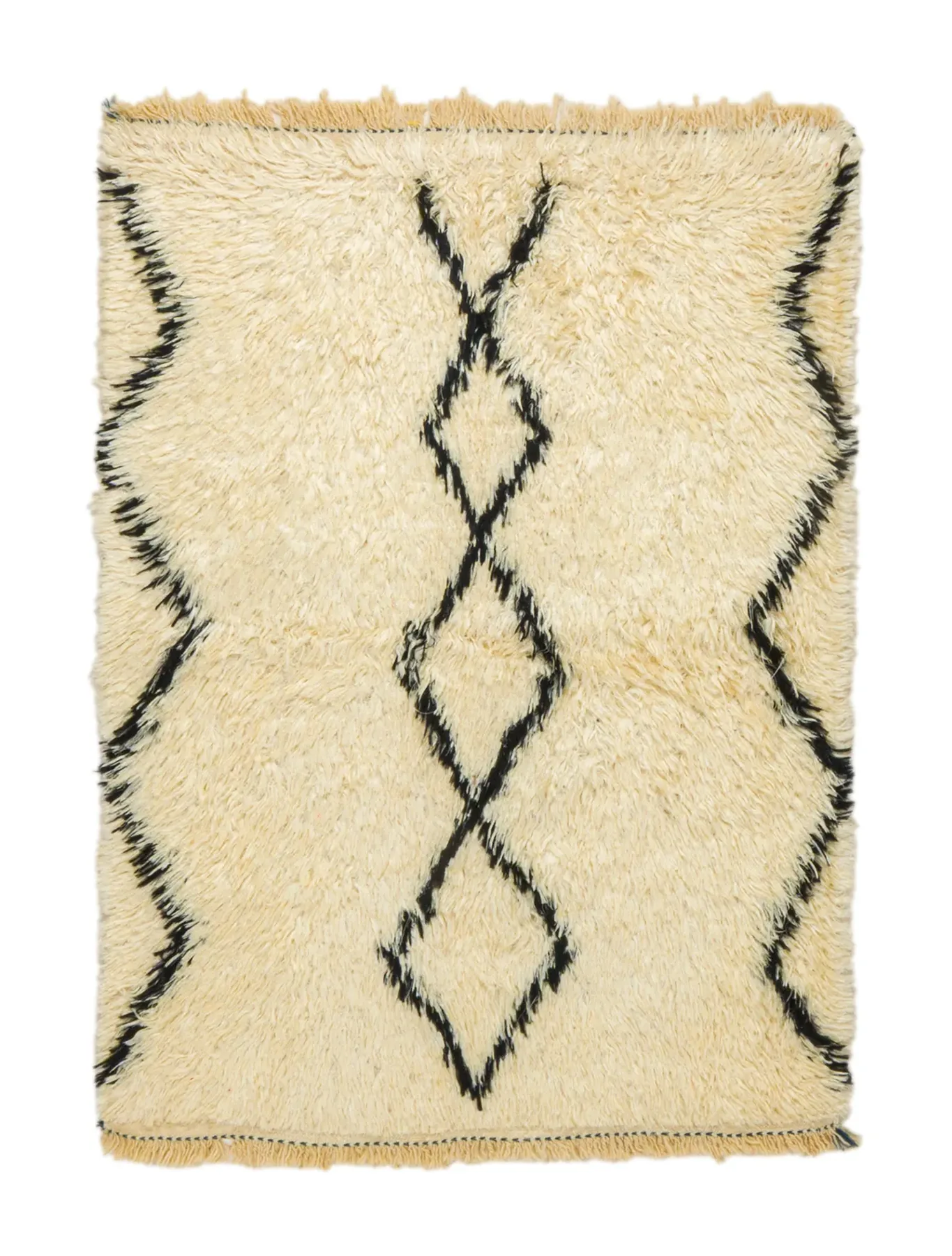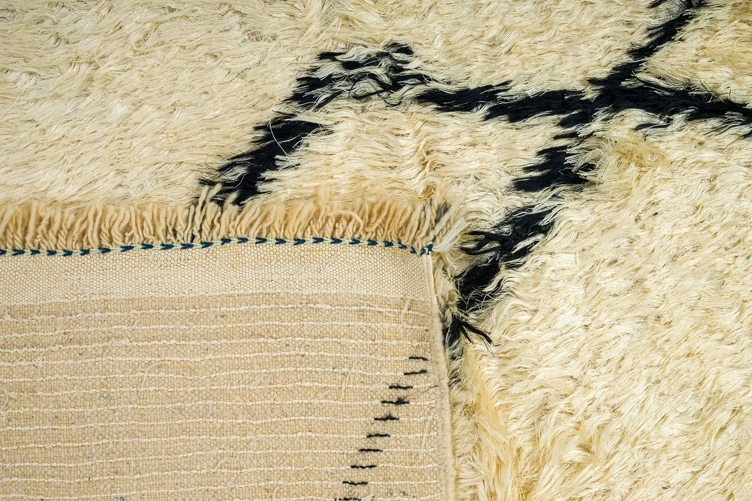Silky ivory with a black diamond spine – This silky rug draws its quiet strength from contrast: luminous ivory and deep black, restraint and radiance. A stack of angular lozenges runs through its center, like a woven constellation, grounding the shimmering surface in clarity and form. Handwoven from fine silk, its low pile reflects light delicately, giving it a soft, fluid energy. Understated yet magnetic, Soraya is a luminous statement in minimalism.