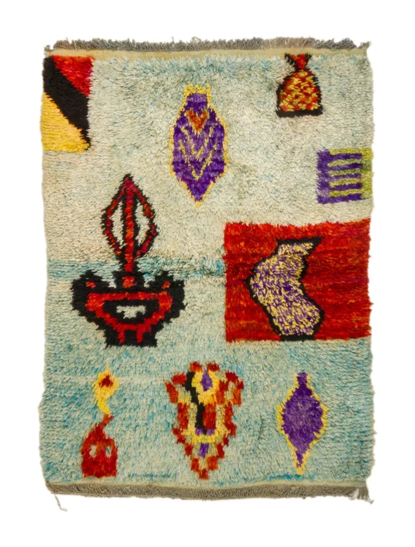 Light blue field with abstract floating motifs – A scattering of vibrant symbols — red, violet, ochre — floats over a soft blue field like fragments of memory. Each form is hand-knotted in luminous silk, giving the rug an iridescent shimmer that shifts with the light. A fluid, expressive piece that feels both spontaneous and composed.
