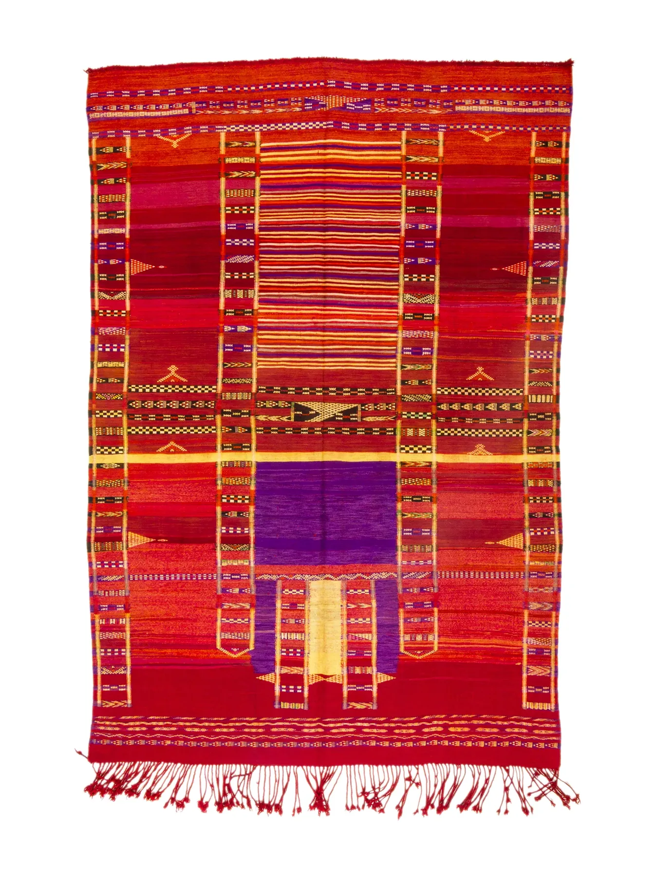 Crimson Ceremony in Vintage Silk – A deep crimson and violet silk rug woven with the precision of old ceremonial garments. From the central ladder-like structure to its dense tapestry of symbols, Hafida is an homage to regality and preservation. Recycled from vintage Moroccan silks and handwoven with astonishing clarity, it retains the solemn grandeur of garments meant to endure.