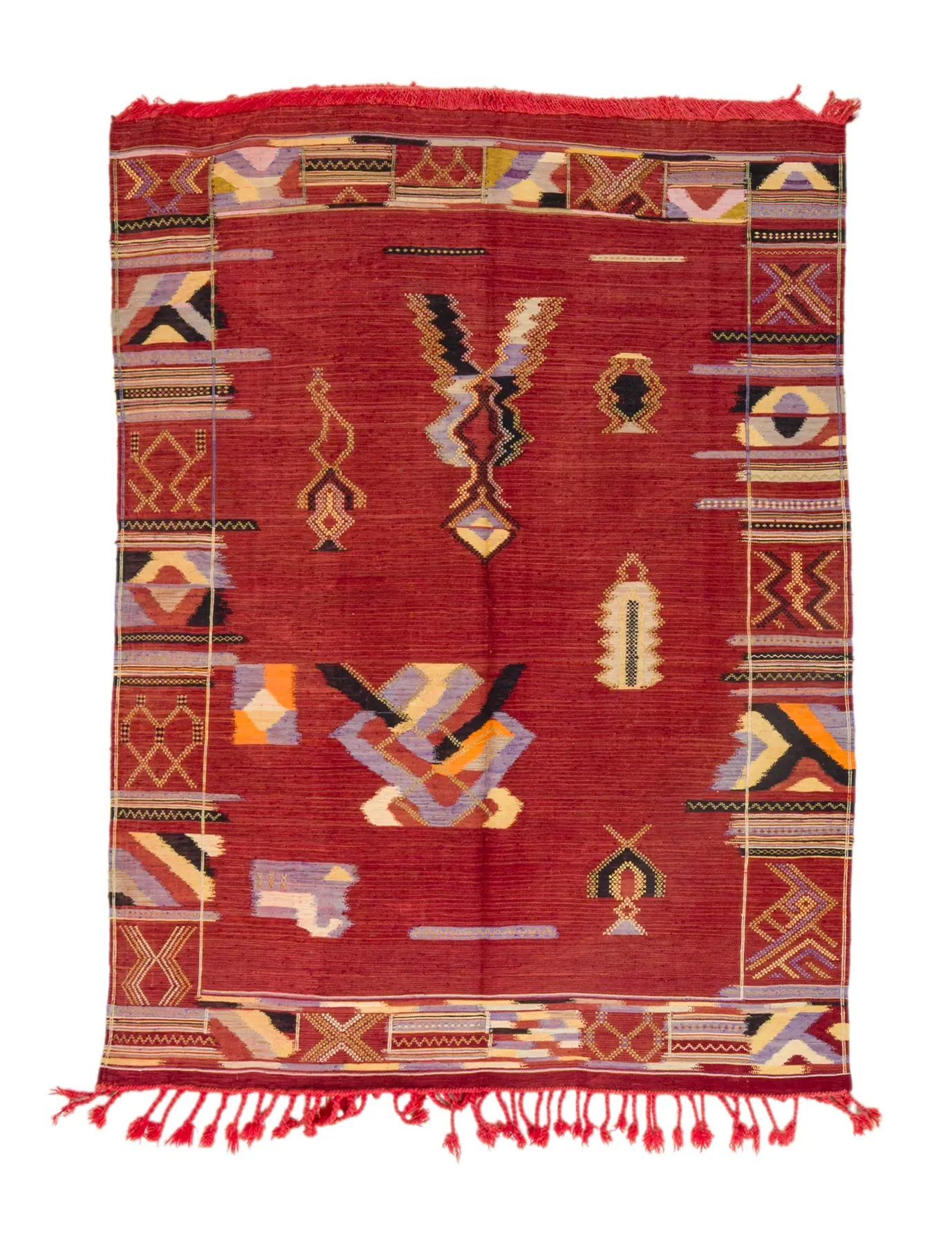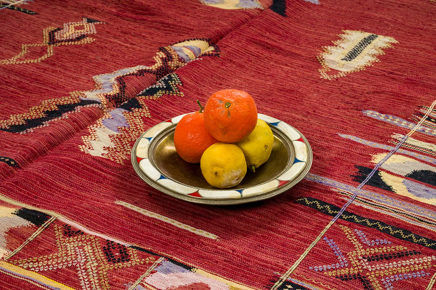 Terracotta Symbols in Vintage Silk – This matte silk rug features a rich terracotta base scattered with coded motifs — stars, combs, arrows, and ancestral marks. Woven from vintage silk pieces once worn and treasured, Illy is an archival record in motion. A flat weave that holds layers of memory beneath its crisp surface.