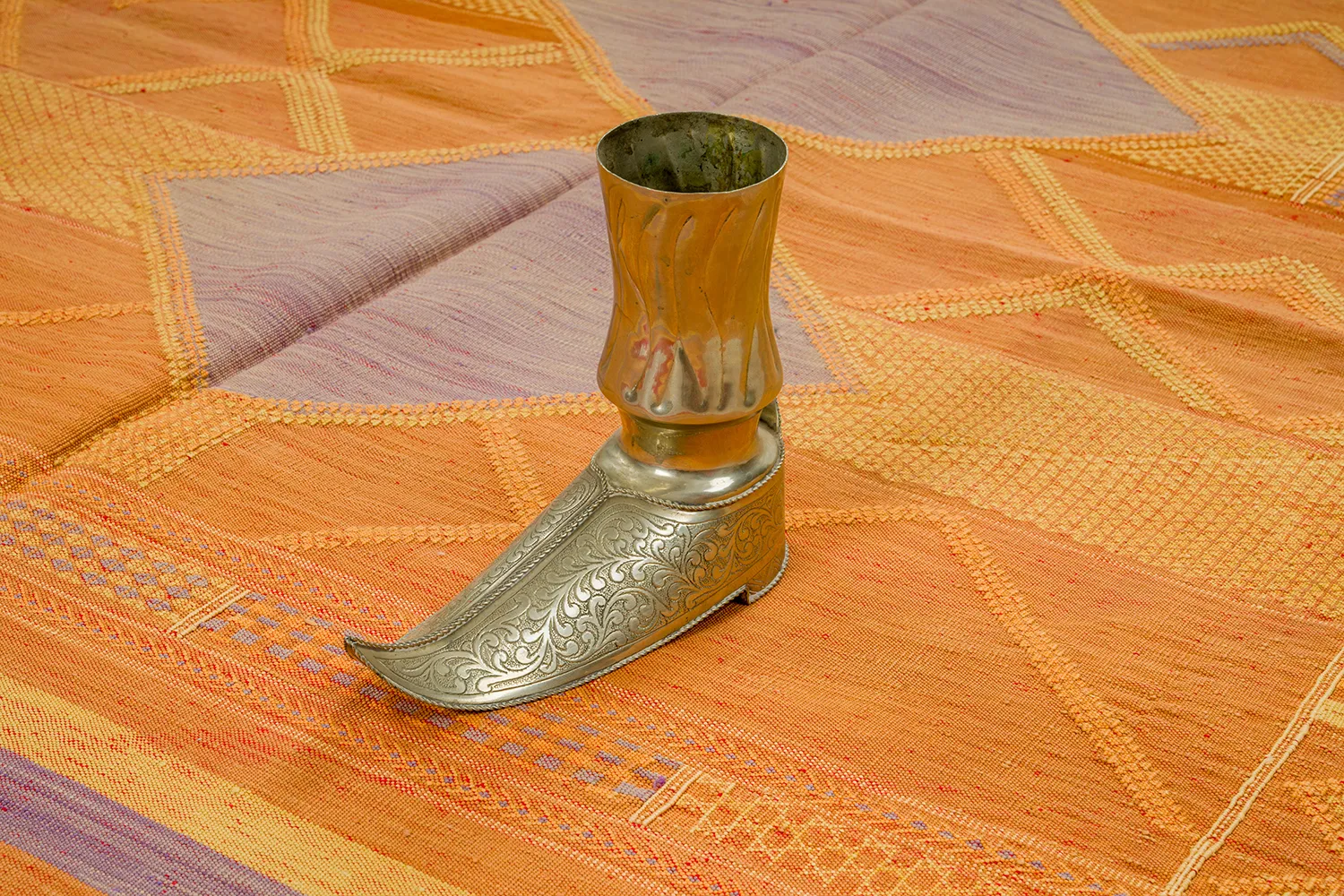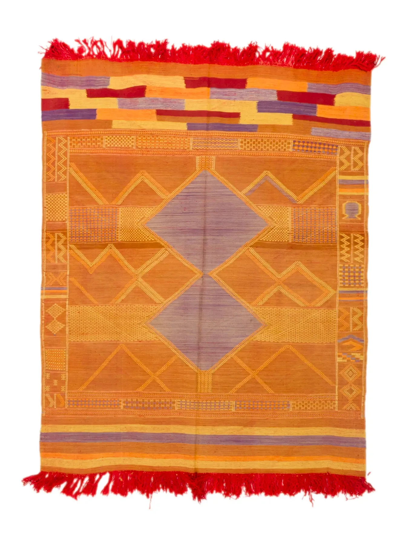 Amber Grid with Apricot Details – A quiet matte silk rug in amber and apricot, its symmetry drawn from classical Moroccan geometry. It mimics the structure of hand-embroidered panels once used in traditional clothing and furnishings. Khizana feels like an opened archive, offering form and color stripped of gloss—but rich in tactility.