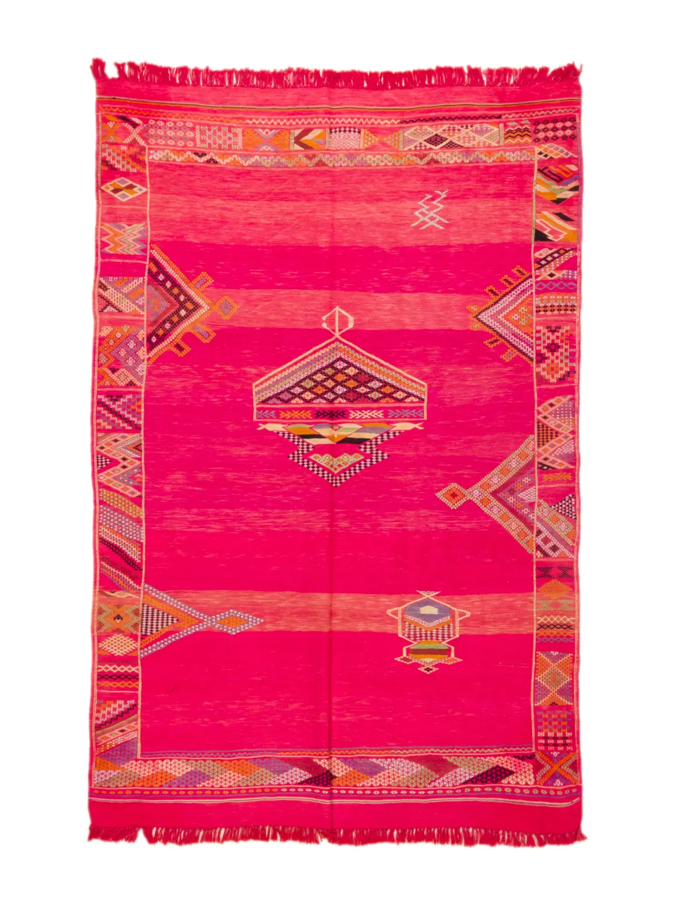 Red Frame with Coral Layering – Like a saturated photograph developed in red light, this rug is composed of layers of pink and coral silk — each tone subtly aged. The matte texture, derived from recycled garments, brings a softness to its vividness. Souria is both artifact and image, preserved in thread.