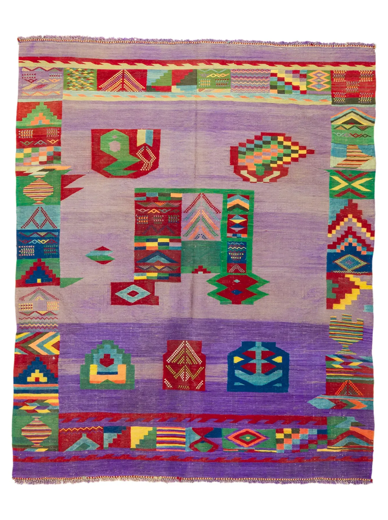 Lilac Field with Crimson and Jade Details – This matte silk piece is quiet and deliberate: lilac fields bordered with small geometrics in crimson, jade, and saffron. Tiraz refers to both embroidered borders and familial lineage, and this rug captures both meanings. It’s soft-spoken, but full of detail for those who look closer.