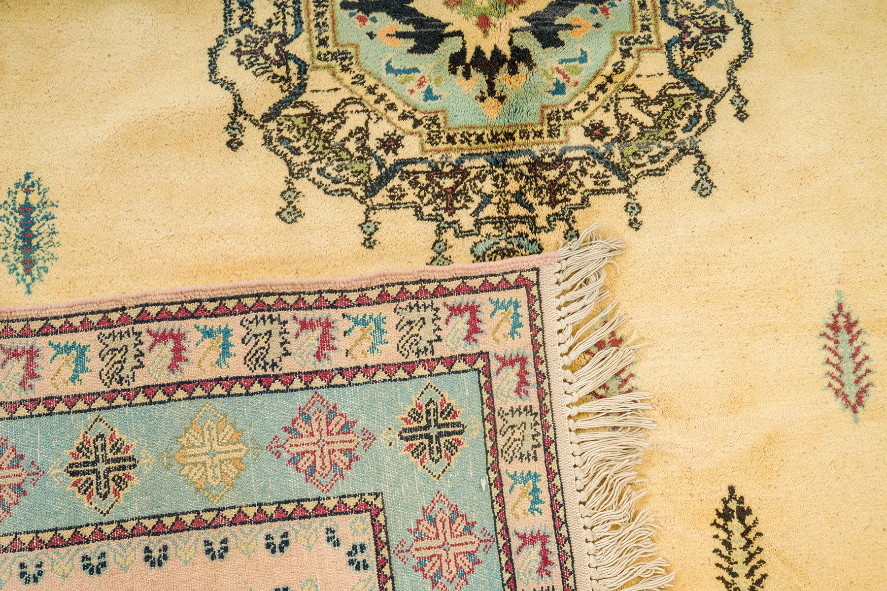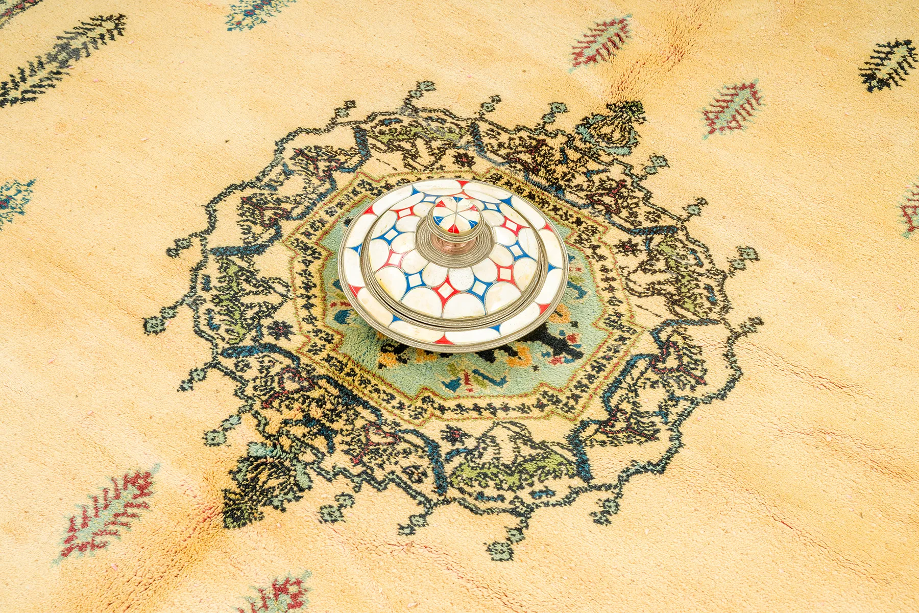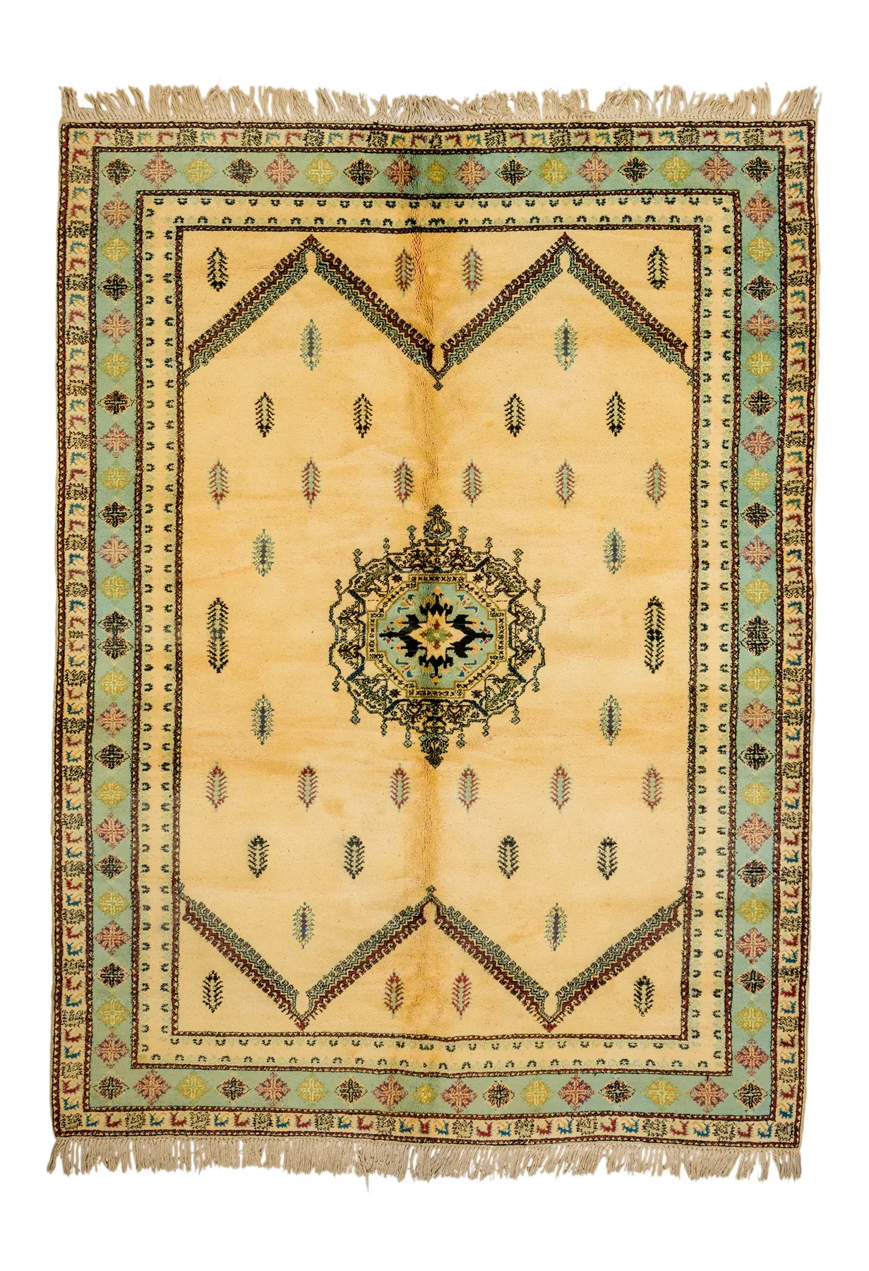 Golden Field with Ornamental Medallion – A luminous Rbati rug with a golden sand-toned field, centered by an intricate medallion in deep green, blue, and black. Scattered leaf motifs create rhythm and texture across the surface. Framed by pale turquoise borders, it’s a soft yet refined composition made for calm spaces.