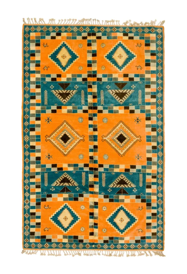 Vibrant Patterns on a Stunning Brown Base – This Moroccan Rabati rug is a celebration of color and artistry. A rich, vibrant brown base sets the stage for a captivating display of geometric patterns. Intricate medallions, stylized figures, and dynamic motifs create a visual feast that adds a touch of drama and personality to any space.