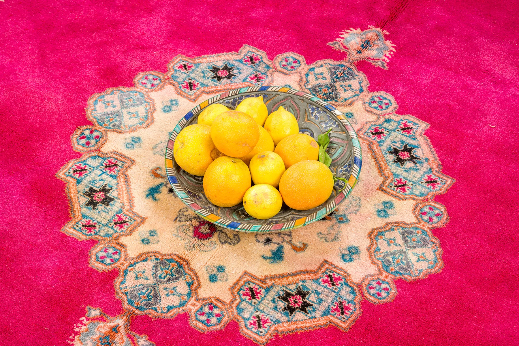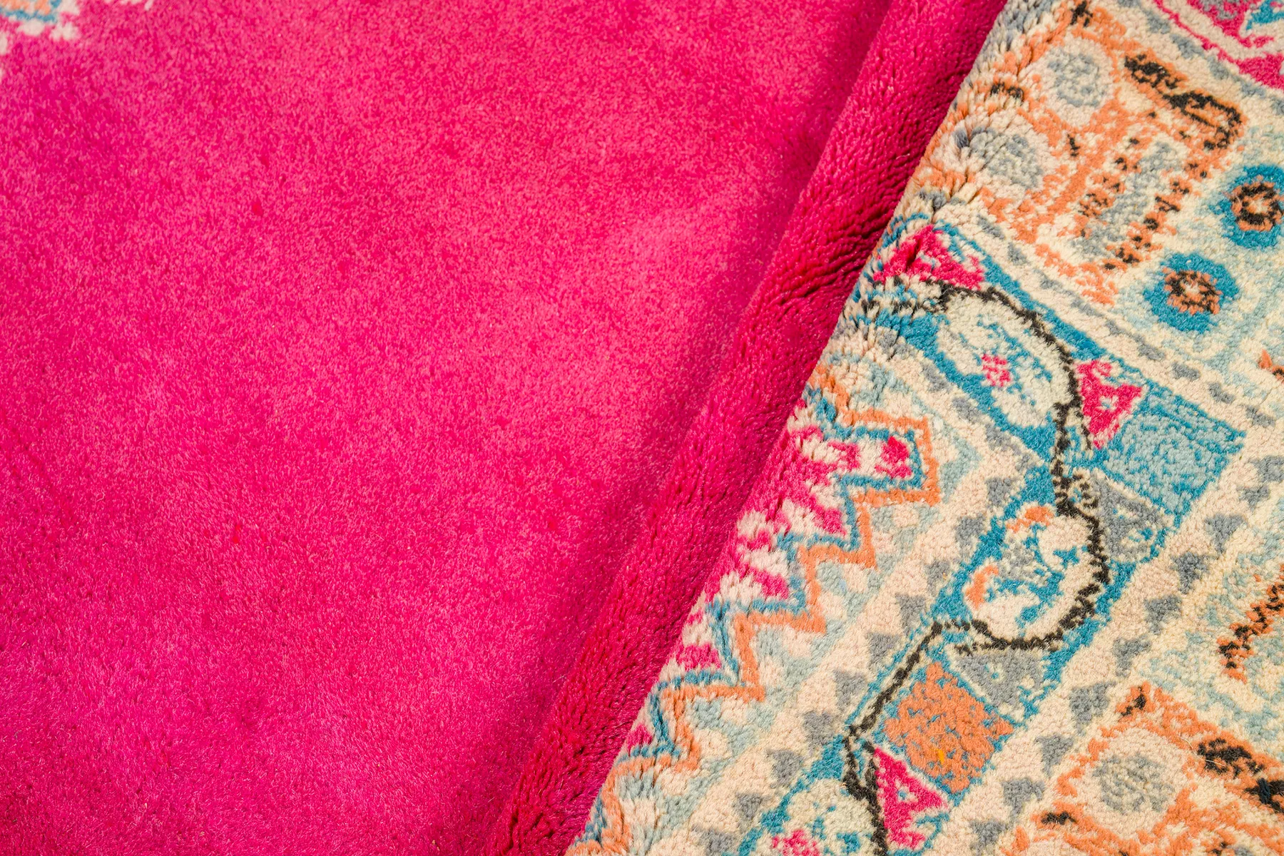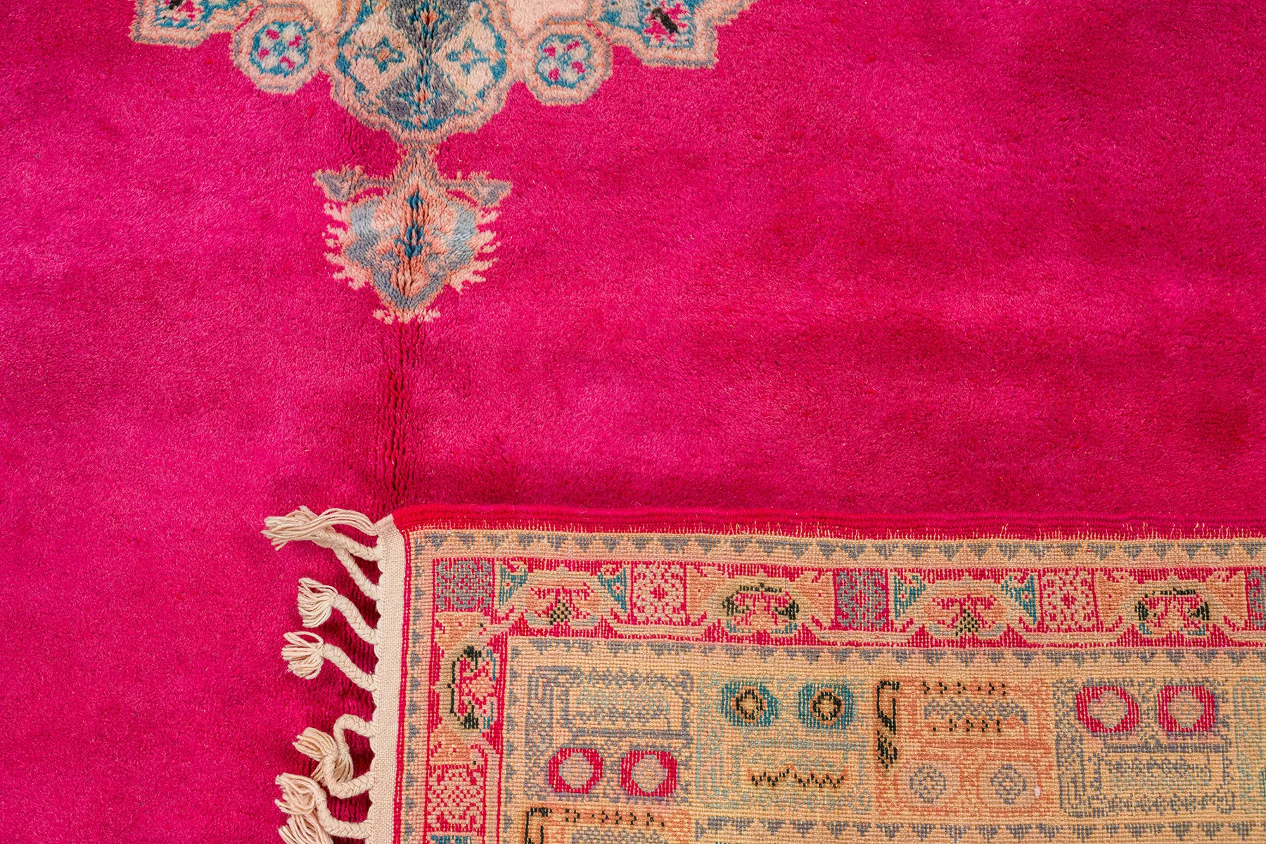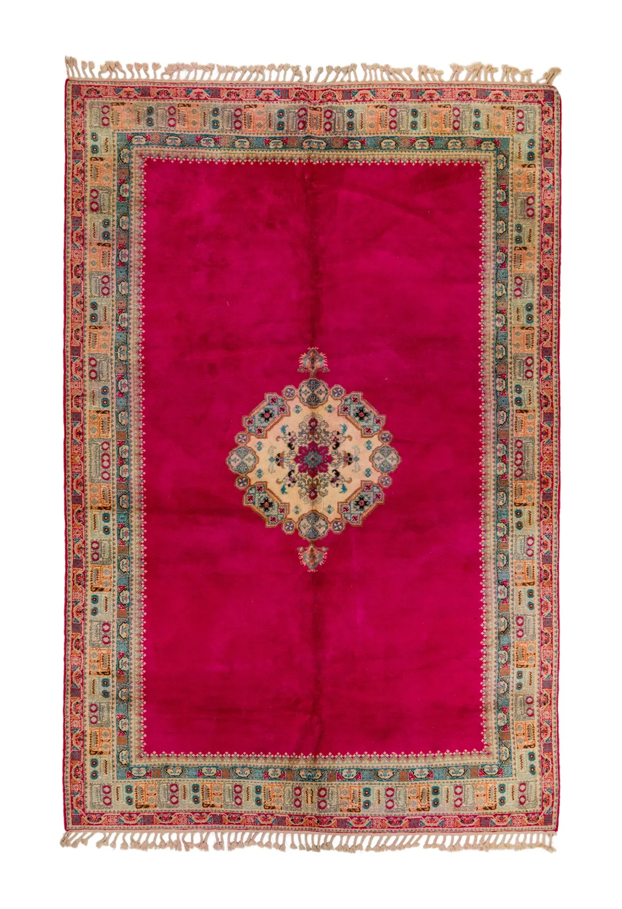 Fuchsia Field with Cream Medallion – A bold fuchsia field surrounds a delicate cream medallion adorned with rose, turquoise, and charcoal floral work. The ornate border—punctuated with turquoise and gold—adds structure without overpowering the quiet elegance of the center. Poised, plush, and full of presence.