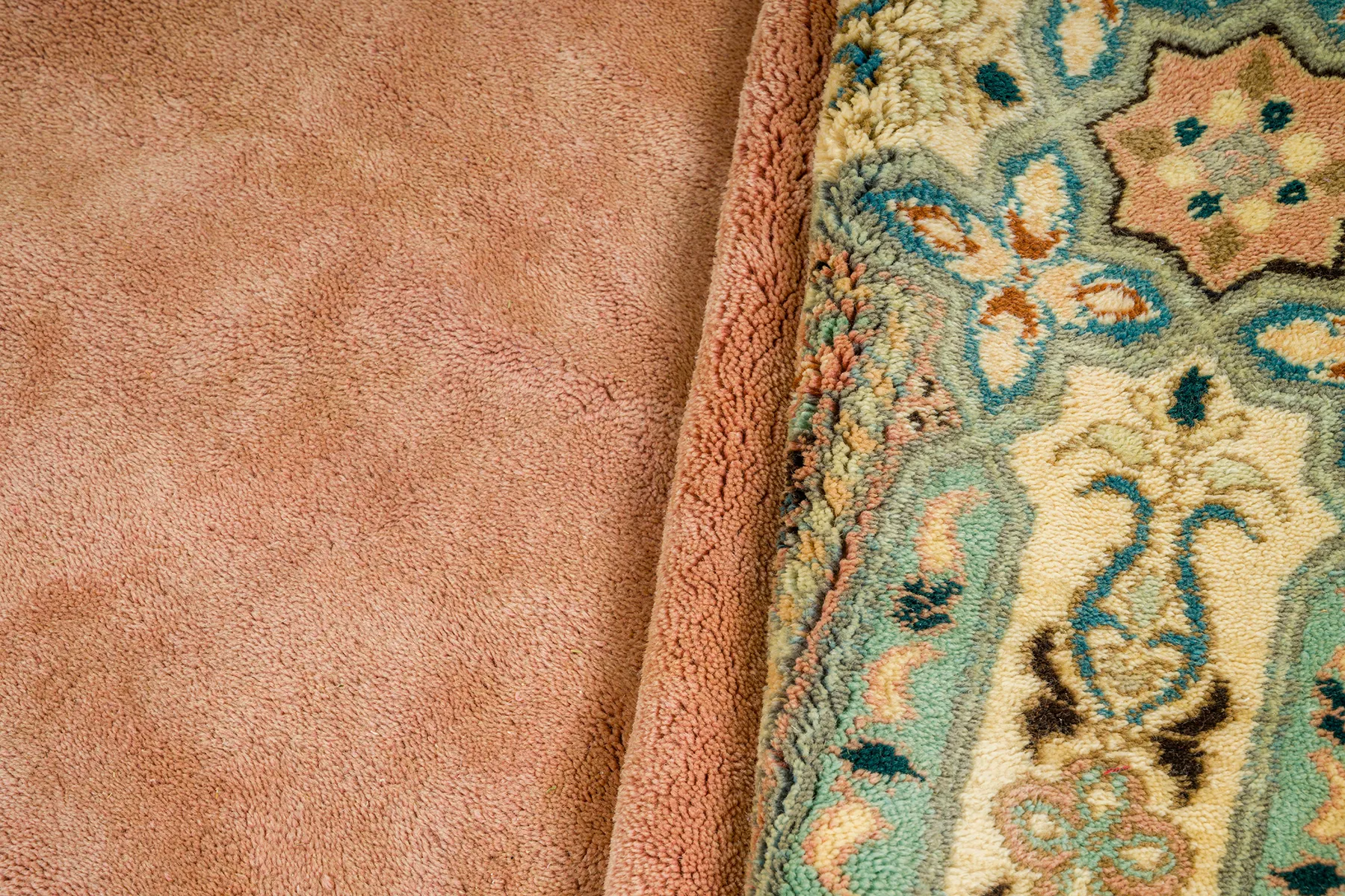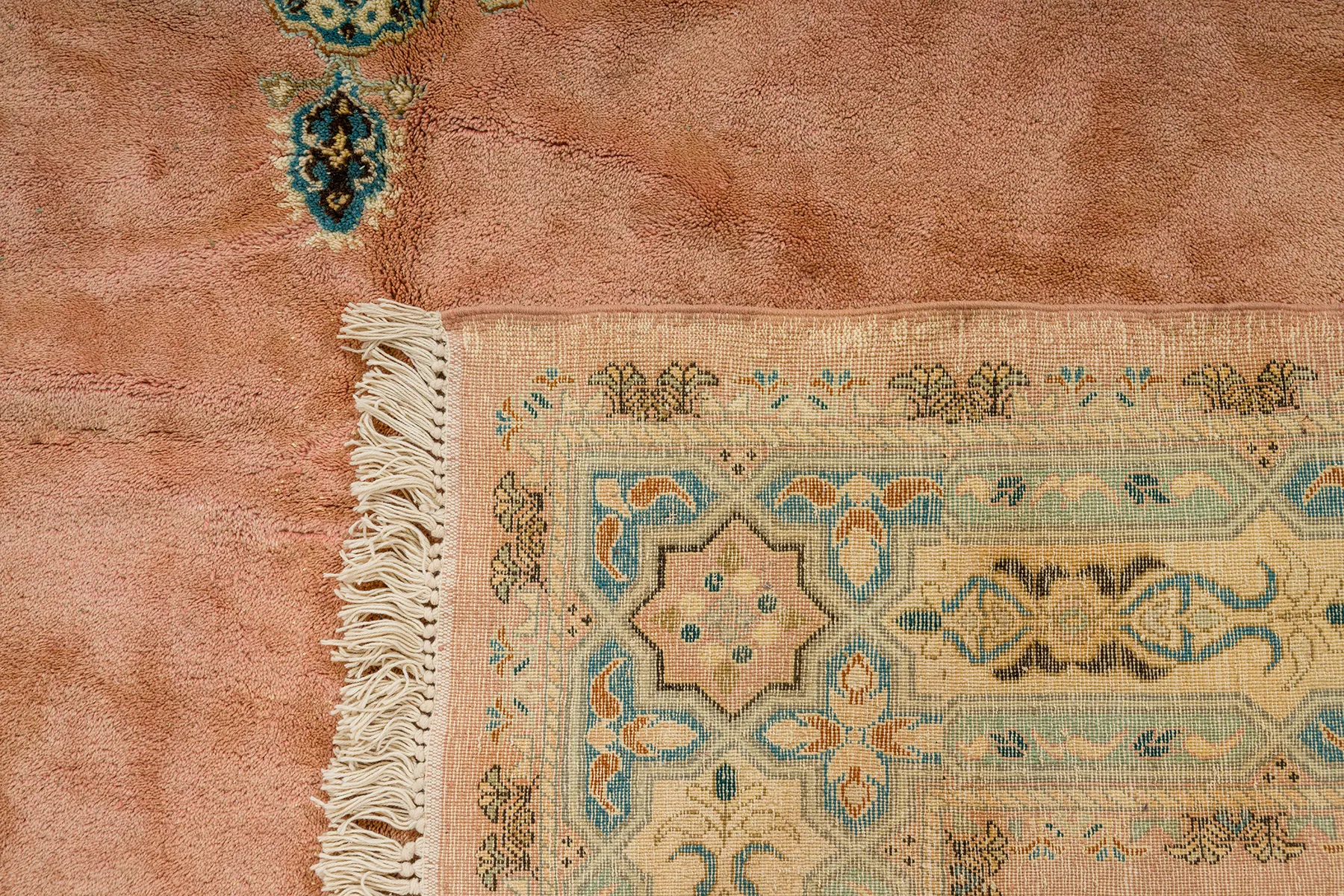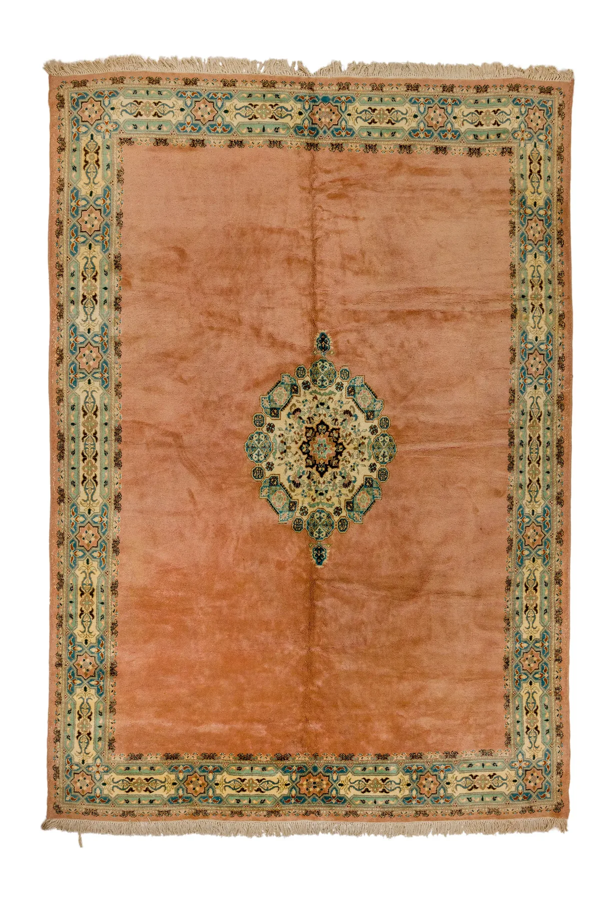 Blush Field with Garden Medallion – A soft blush-toned field surrounds a single ornate medallion in floral symmetry, evoking the feel of an enclosed garden. Framed with turquoise and ivory arabesques, this rug carries quiet elegance and refined simplicity — a timeless accent of calm and beauty.