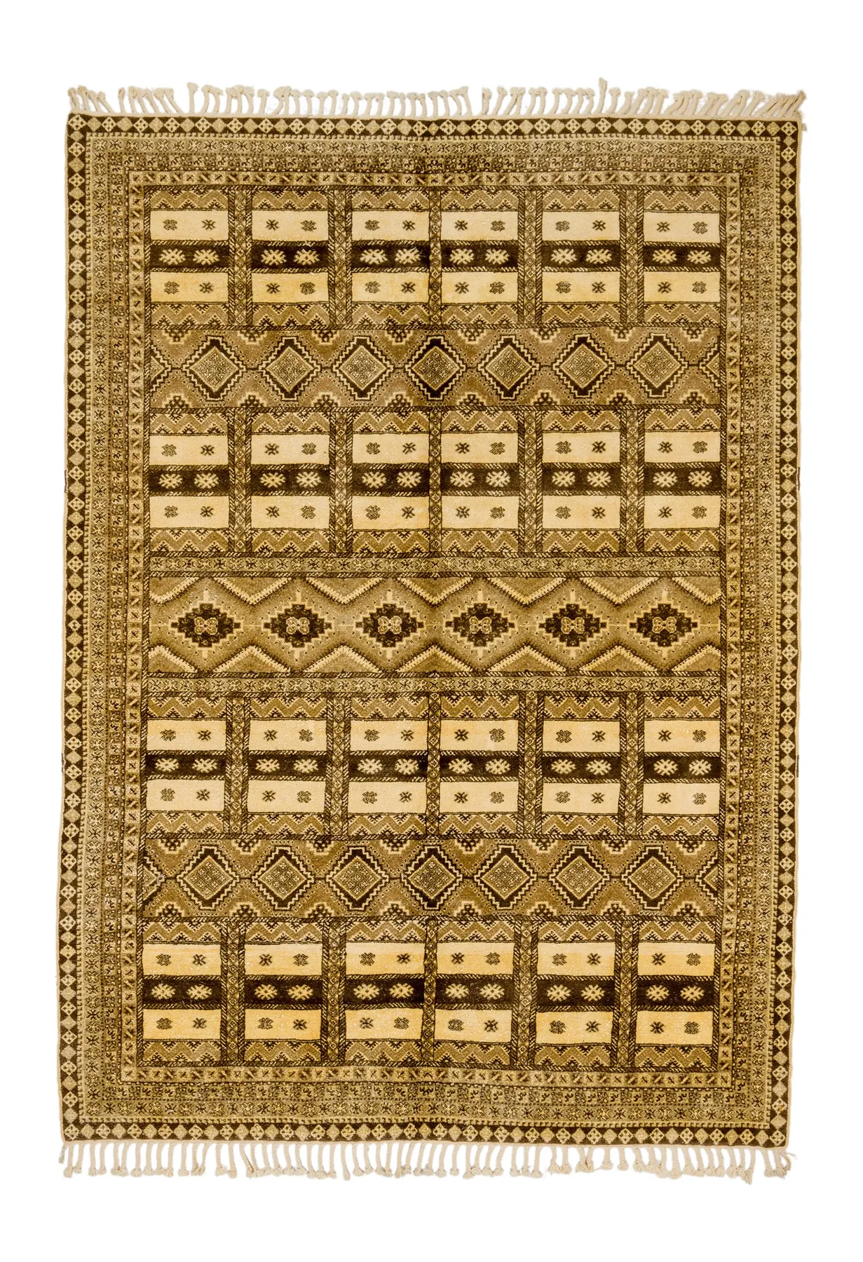 Geometric Grid in Sand and Walnut – This rug features a structured grid of repeating symbols — diamonds, stepped lines, and stacked motifs — in shades of sand, camel, and walnut. Its earthy palette and balanced composition honor ancestral craft with quiet strength and clarity.