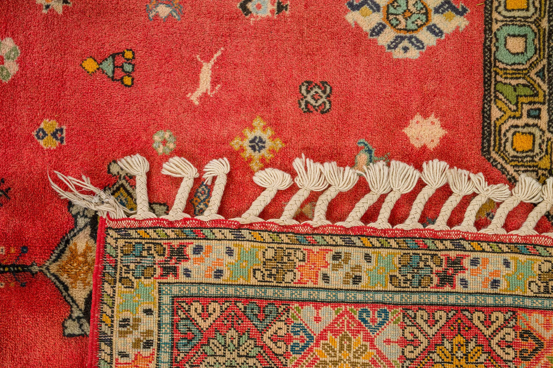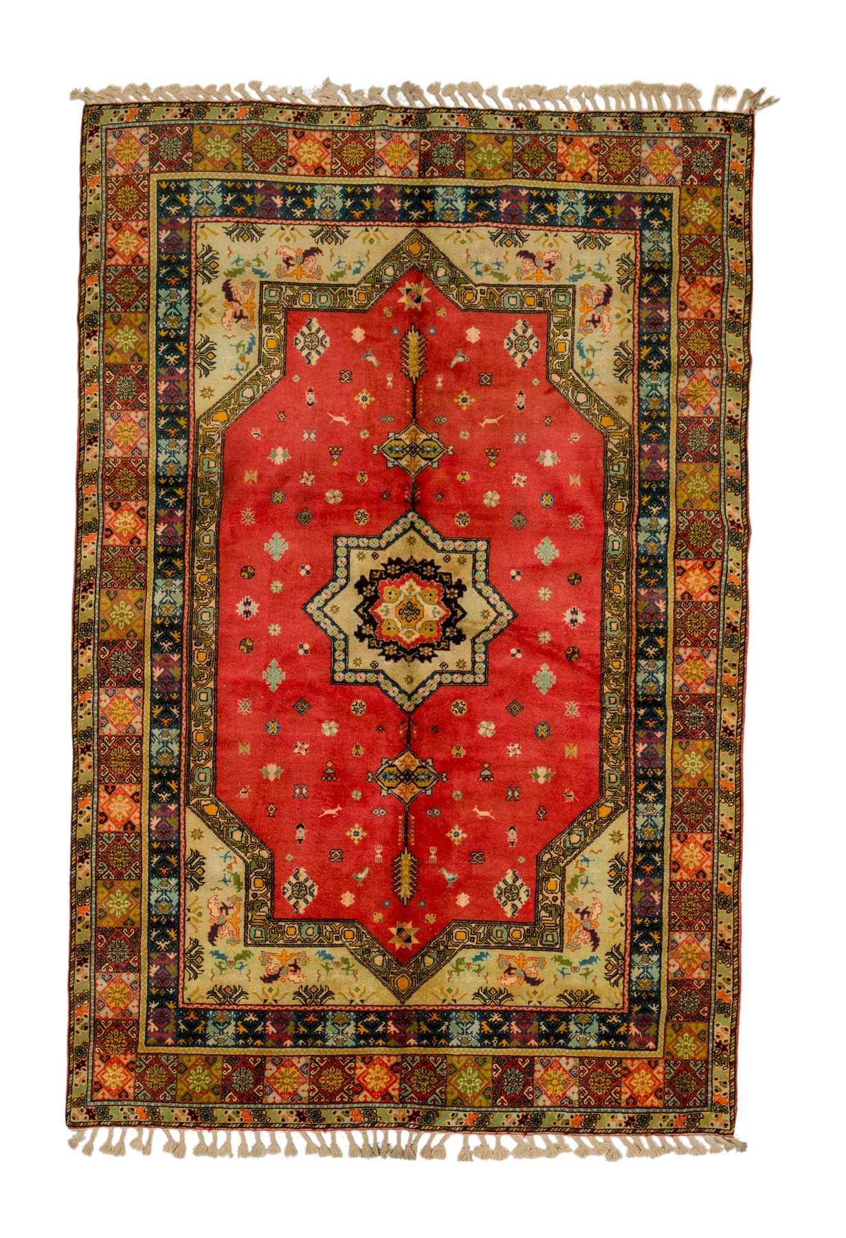 Cherry Red Field with Star Medallion – Set against a cherry red backdrop, this rug features a central star medallion framed by floral bursts, feathered motifs, and softly arched corners. The border blooms with painted vines and blossoms in deep blue and gold. A luminous piece with romantic structure.