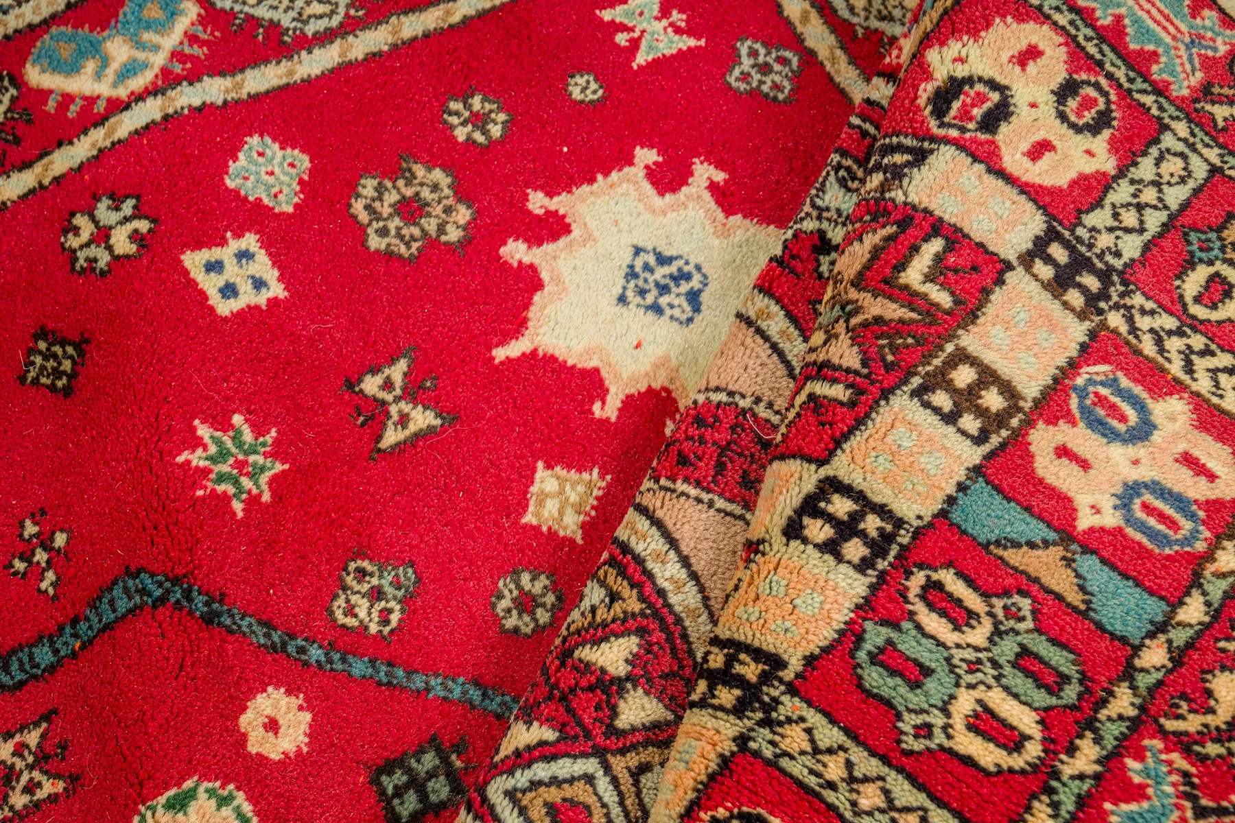 Crimson Field with Framed Motifs – A bright crimson field hosts a cascade of symbolic motifs — each hand-knotted in vivid tones of sapphire, ivory, and emerald. The layered framing evokes embroidered garments or mosaic inlay, transforming this rug into a celebration of ornament, rhythm, and memory.